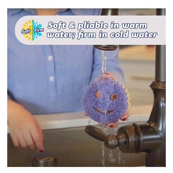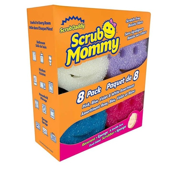 Dual sided Scrub Mommy Color: 2 pink, 2 blue, 2 violet and 2 white assortment Resofoam absorbs more water and generates more suds than an ordinary sponge FlexTexture is soft in warm water and firm in cool water for more scrubbing power Scratch free Odor resistant Ergonomic and functional
