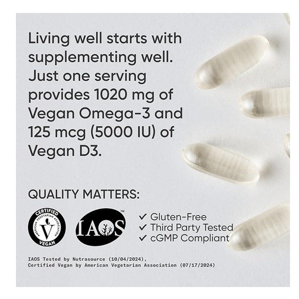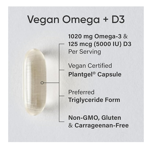 • VEGAN SUPPORT: Just two (2) of our vegan supplements provide 1020 milligrams of naturally occurring omega 3 exclusively derived from plant-based algae oil. Get 1020mg Omega-3 along with 125 mcg (5000 iu) vitamin D3 per serving without any fish oil or animal-derived ingredients. Our vitamin D and omega-3 softgels provide a plant-based source for obtaining essential fatty acids and daily vitamins.