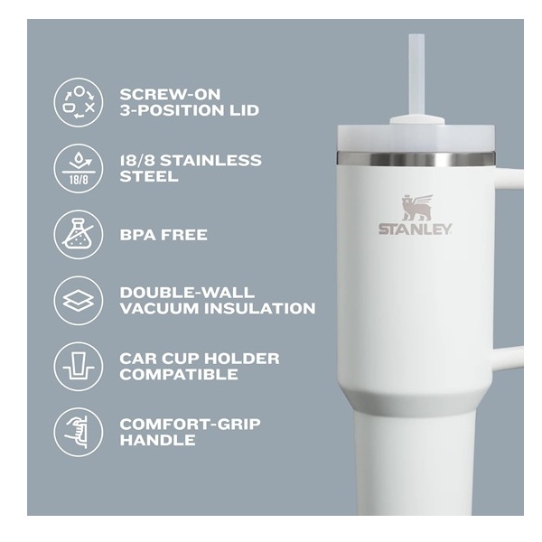 - ADVANCED LID CONSTRUCTION: Whether you prefer small sips or maximum thirst quenching, Stanley has developed an advanced FlowState lid, featuring a rotating cover with three positions: a straw opening designed to resist splashes with a seal that holds the reusable straw in place, a drink opening, and a full-cover top for added leak resistance. We’ve also included an ergonomic, comfort-grip handle, so you can easily carry your ice-cold water to work, meetings, the gym or trips out of town.