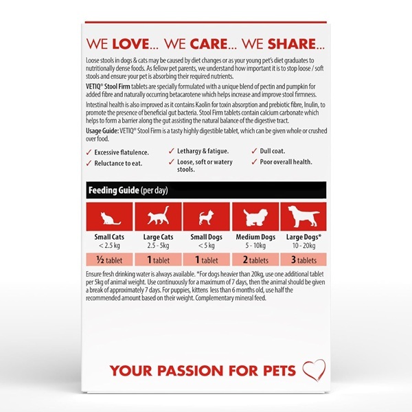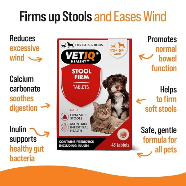VETIQ Stool Firm tablets Aids the relief of symptoms of mild diarrhoea that your pet may experience. They are specially formulated with a unique blend of pectin and pumpkin for added fibre and naturally occurring beta-carotene which helps increase and improve stool firmness.
